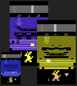 Avoid laser shot along floor—as well shooting through it—to eventually shoot the monster. LHS numbers are the player's. First to zero wins. As you approach victory, electric rain will fall; this should be avoided.